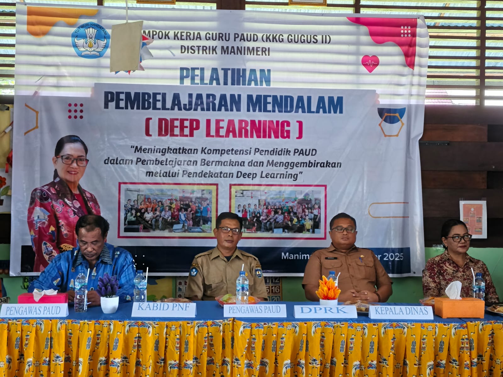 Bintuni | Mediaprorakyat.com – Kepala Dinas Pendidikan, Kebudayaan, Pemuda, dan Olahraga Teluk Bintuni, Dr. Henry D. Kapuangan, S. Pd., MM., secara resmi membuka pelatihan pembelajaran mendalam (Deep Learning) bagi para kelompok kerja guru PAUD (KKG Gugus II) Distrik Manimeri. Kegiatan ini berlangsung di salah satu ruang kelas TK SP 5 pada Senin, (13/10/2025) sebagai upaya meningkatkan kualitas pembelajaran di jenjang PAUD melalui pemanfaatan teknik pembelajaran berbasis ilmu data dan analitik modern.