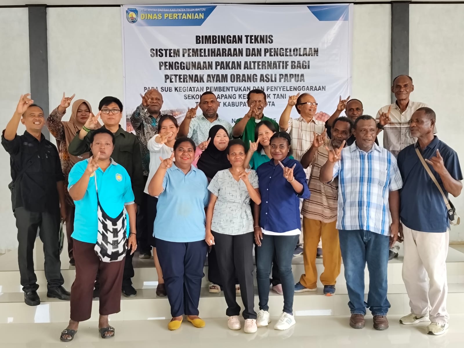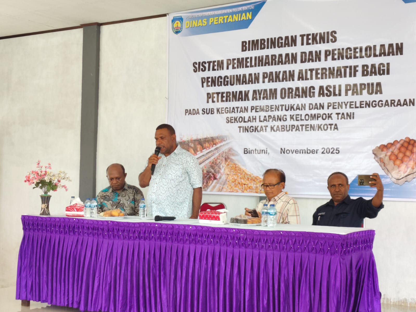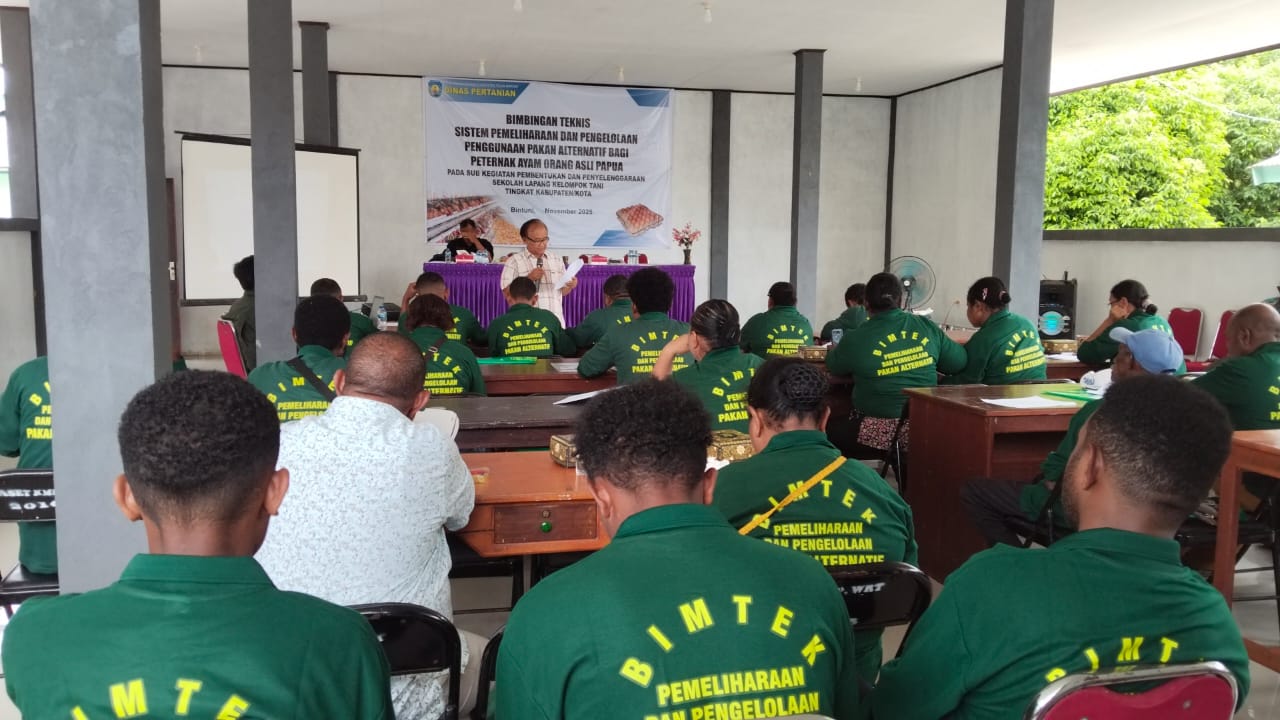 Bintuni | Mediaprorakyat.com — Dinas Pertanian Kabupaten Teluk Bintuni kembali menggelar Bimbingan Teknis (Bimtek) untuk meningkatkan kapasitas peternak lokal, khususnya peternak ayam Orang Asli Papua (OAP). Kegiatan bertema “Sistem Pemeliharaan dan Pengelolaan Penggunaan Pakan Alternatif” ini berlangsung di Balai Kampung Waraitama, Distrik Manimeri, Sabtu (15/11/2025).